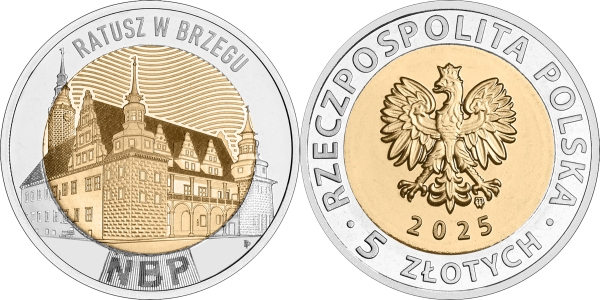 Narodowy Bank Polski przedstawił wizerunki monet Ratusz w Brzegu o nominale 5 zł (pierścień: MN 25, rdzeń: CuAl6Ni2) z serii Odkryj Polskę, których emisja planowana jest na dzień 26-11-2025. Planowany nakład monety: do 1.000.000 sztuk.