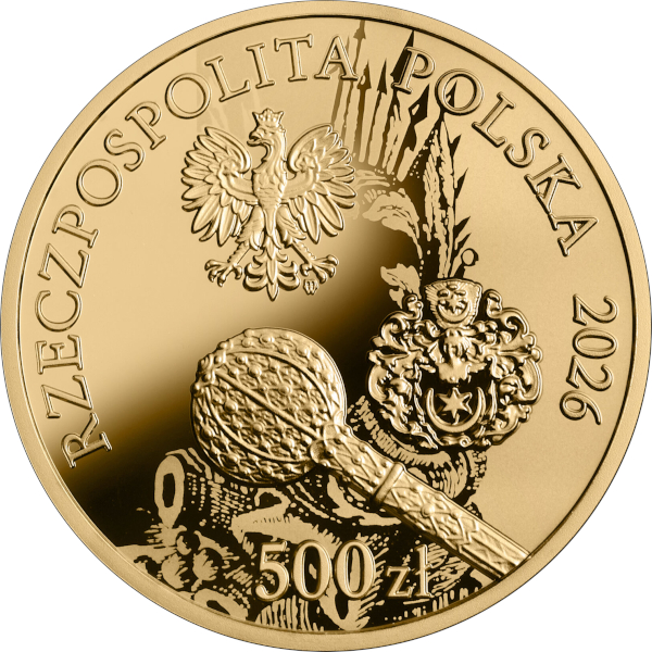 U góry wizerunek orła ustalony dla godła Rzeczypospolitej Polskiej, pod orłem, po prawej stronie, znak mennicy: m / w. Poniżej orła, z prawej strony, herb Jana Tarnowskiego, z lewej strony buława oraz u dołu napis: 500 zł. Wzdłuż górnego brzegu półkolem napis: RZECZPOSPOLITA POLSKA 2026. W tle motyw dekoracyjny z elementów uzbrojenia, sztandarów i proporców.